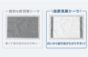 前述の通常タイプに比べ、厚手のタイプ且つ、炭繊維を配合することにより臭いを軽減する仕様になっています。こちらもレギュラーとワイドの2サイズ展開です。炭繊維を配合することにより、アンモニアなどの臭気成分を吸着し、嫌なニオイの発生を抑えます。一般的な炭を使用した消臭シーツは表面全てが黒に近いようなグレーカラーの物が多く、尿の色が分かりにくいという点がありましたが、本製品は表面のほとんどを白色にすることで炭繊維を配合していながらも尿の色がわかりやすく、ペットの健康状態をチェックしやすくなっています。