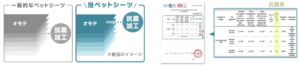 一般的なペットシーツは何層にも重なっているシートの中間部に抗菌加工を施していますが、本製品は表面に抗菌加工を施しています。それにより、排尿した瞬間から細菌の繁殖を抑えることができ、トイレを済ませたわんちゃんが排尿した部分を踏んでしまっても菌の繁殖を抑えより清潔にご使用いただくことができます。